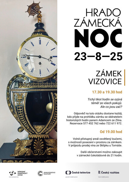 Běžný návštěvník by si možná ani nevšiml, ale plně vybavené interiéry vizovického zámku jsou téměř v každé místnosti doplněny i historickými hodinami. A my jsme pro letošní ročník Hradozámecké noci oslovili sběratele historických hodin, pana Adamce ze Zlína, aby právě na toto téma přichystal prohlídku.